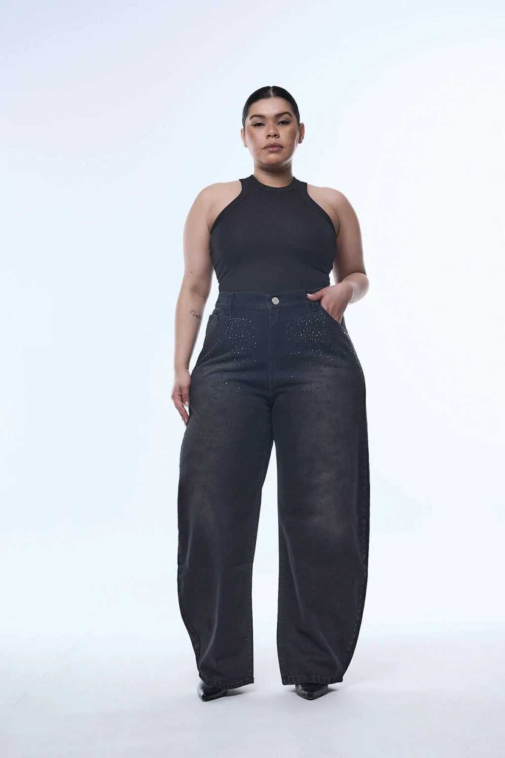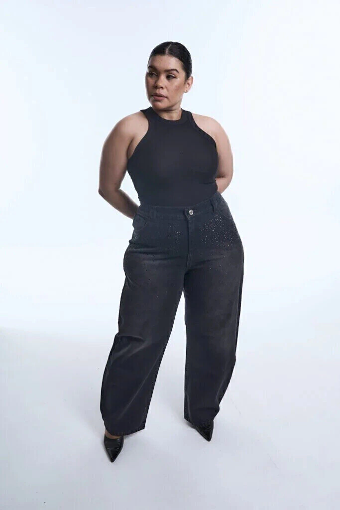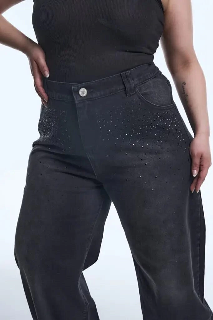 Baggy de jean negro con un leve efecto gastado en la parte frontal, este jean destaca por las pequeñas aplicaciones de strass en la zona superior, que iluminan y le dan un aire moderno. Presenta corte recto y ancho, bolsillos delanteros y traseros funcionales. Perfecto para combinar con básicos como remeras y tops, o con blusas más sofisticadas para un look de noche con un twist urbano.