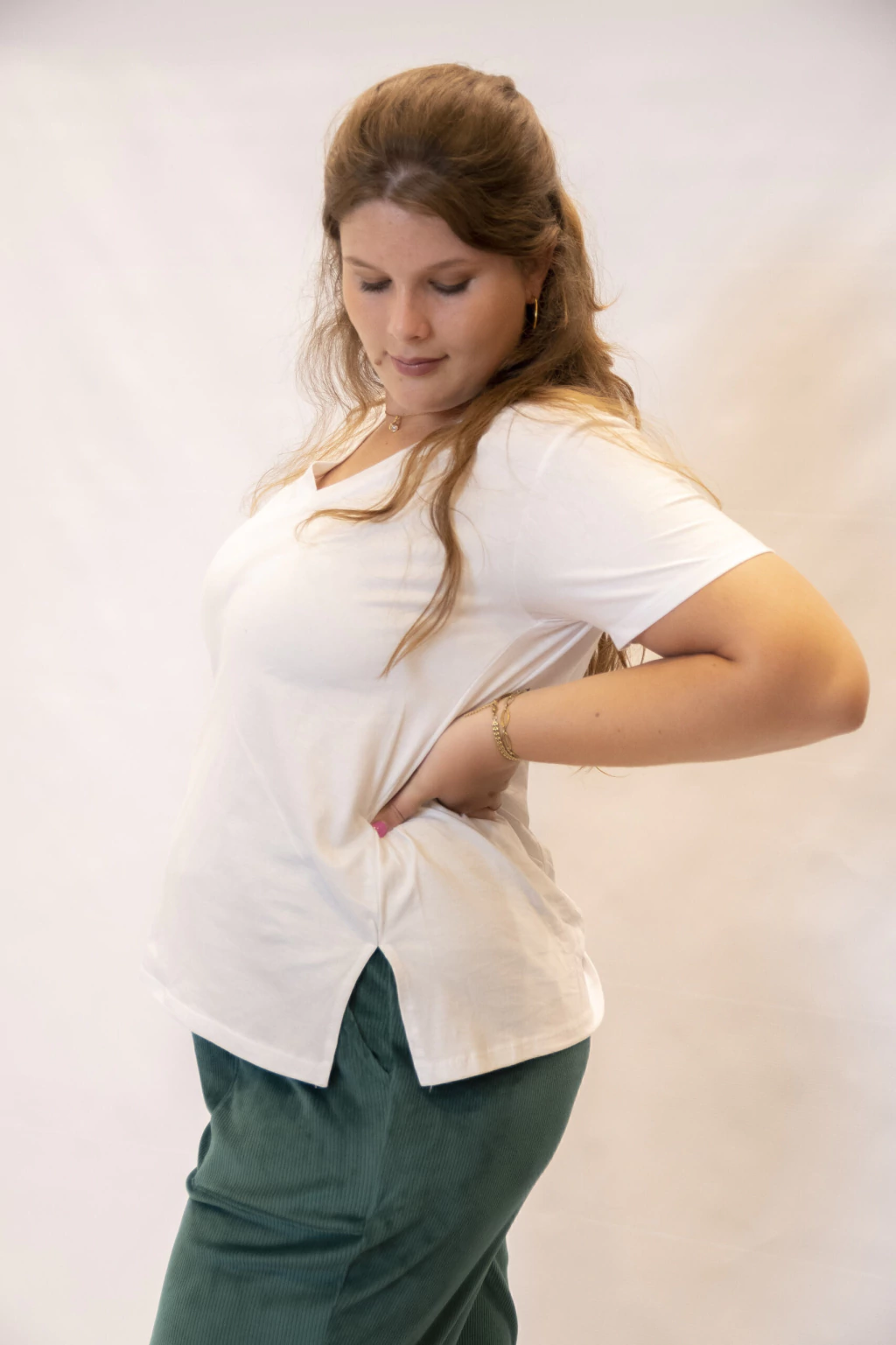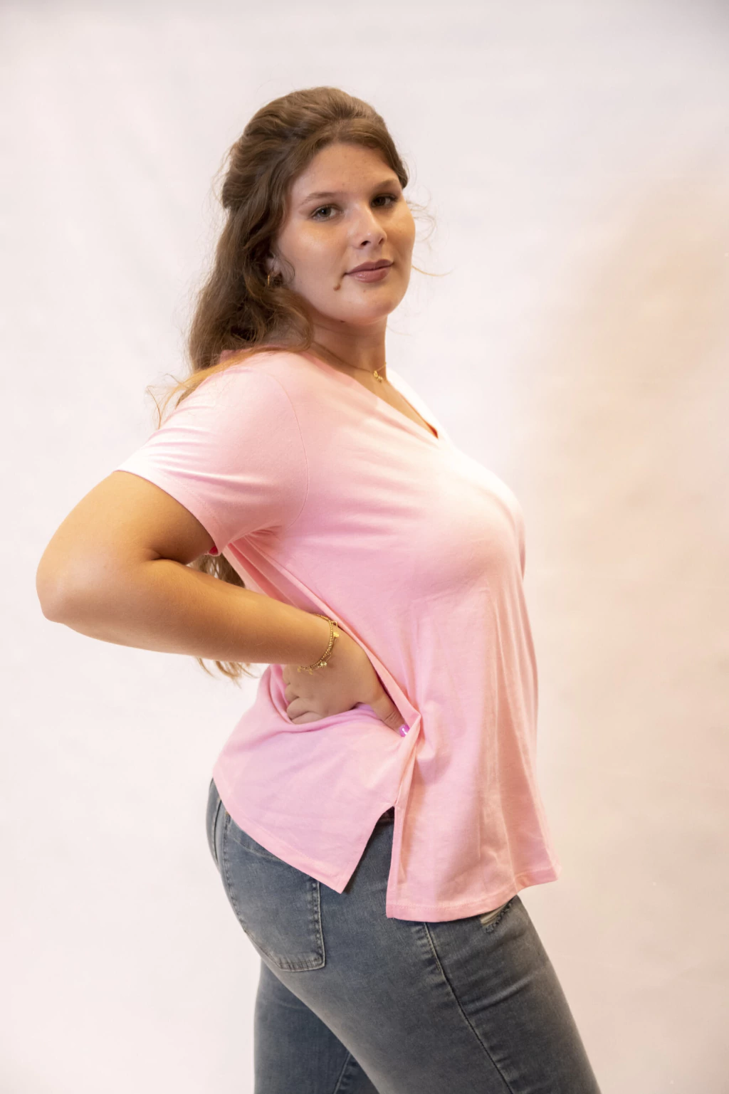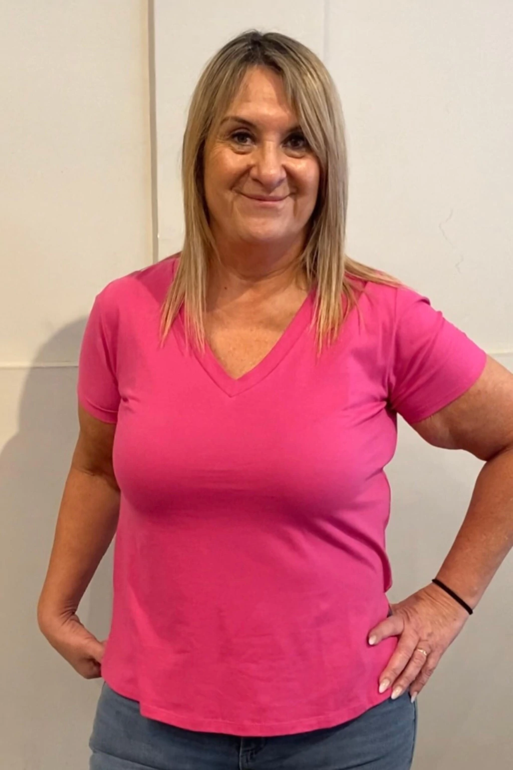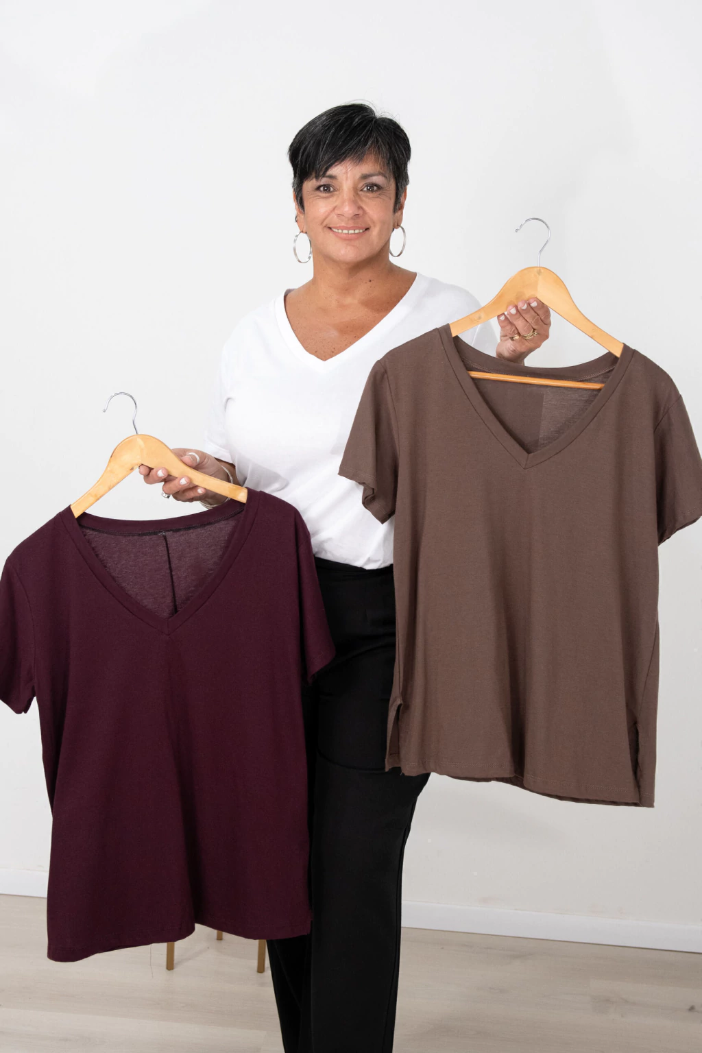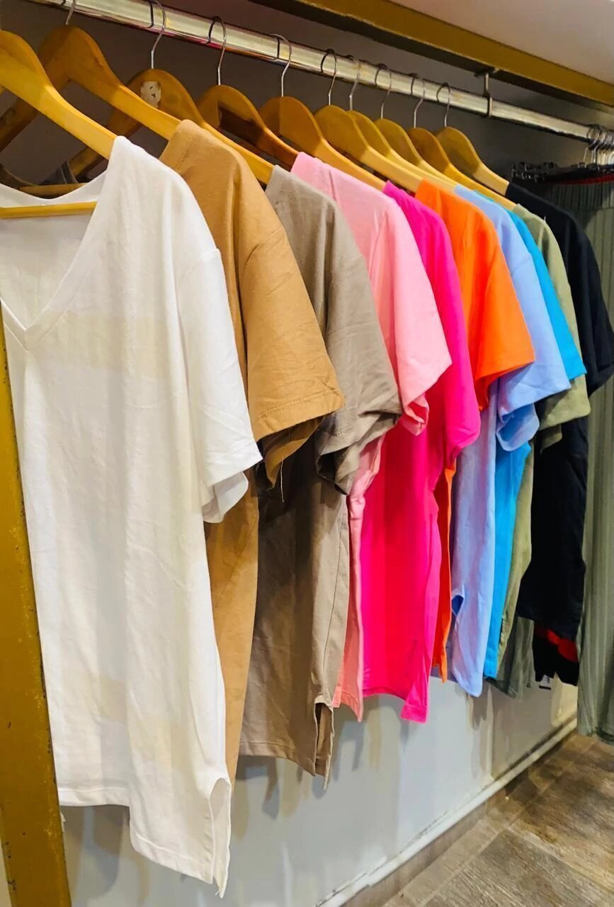 Canchera remera de algodón, cuello V, amplia, mangas cortas. Corte recto, se adapta cómodamente al cuerpo. Colores vivos y de temporada