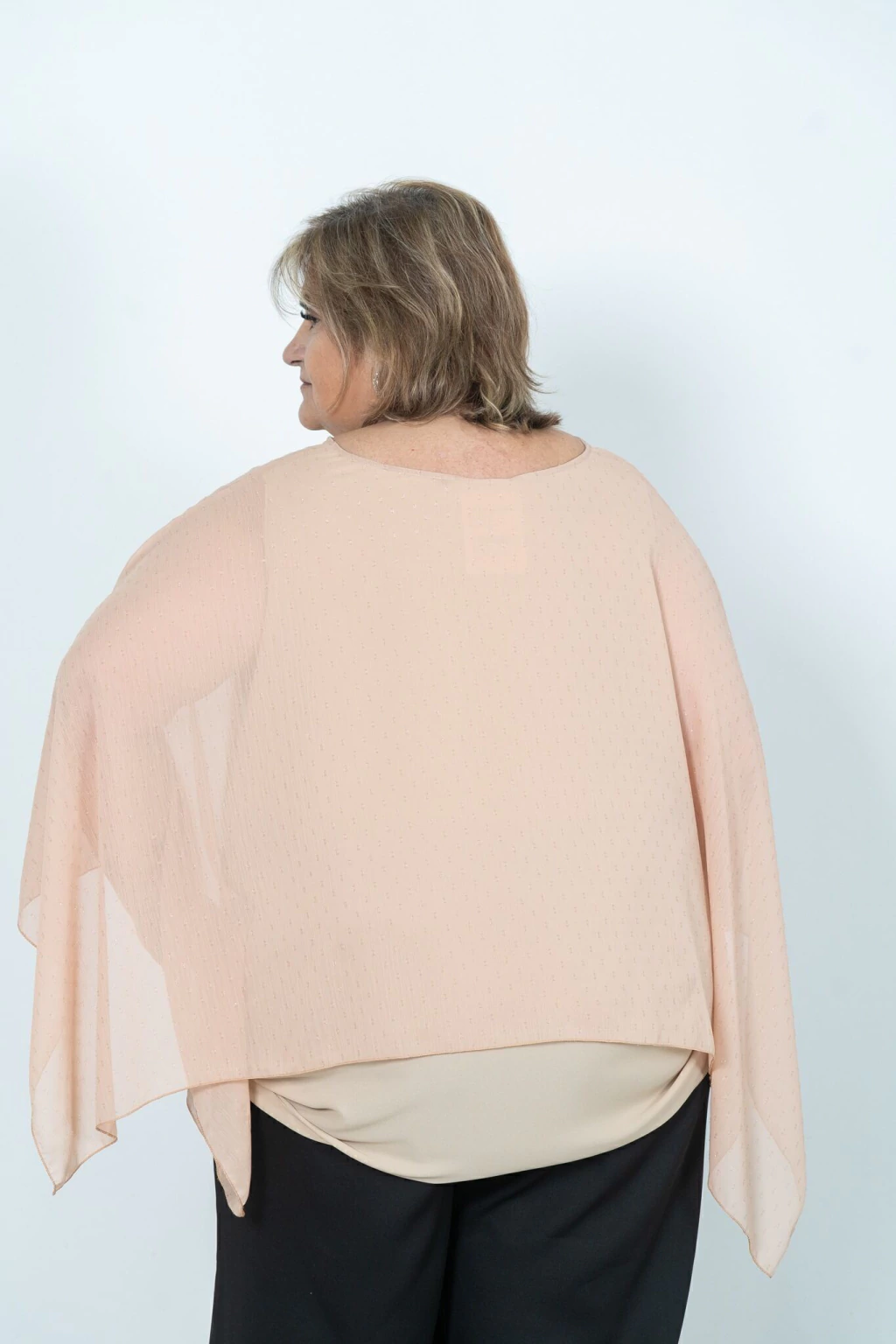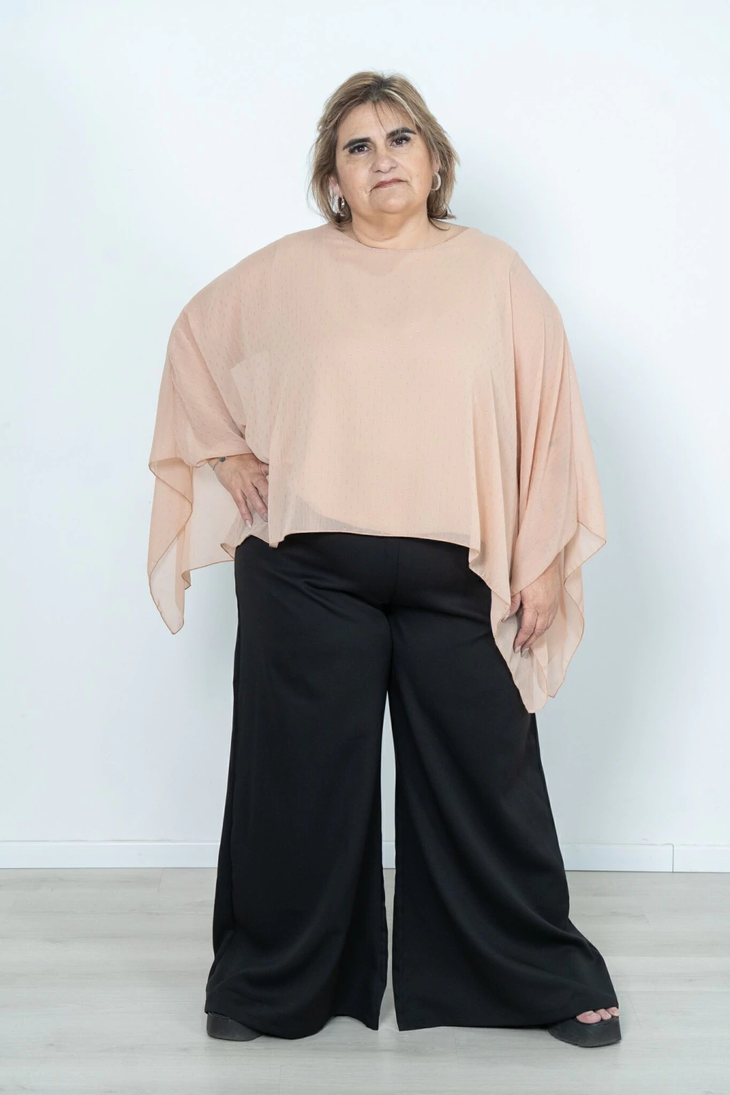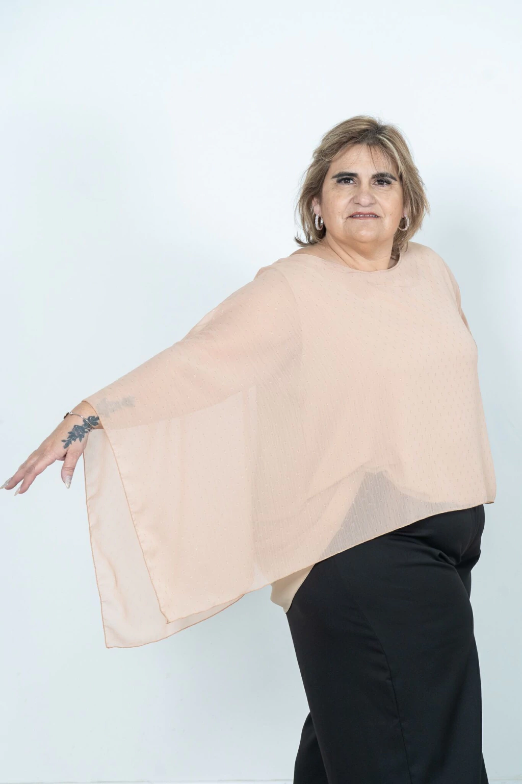 Confeccionada con gasa, ofrece un brillo sutil y refinado que lo convierte en la elección ideal para ocasiones especiales. Su diseño holgado aporta comodidad, mientras que el juego de transparencias en mangas y escote suma un aire moderno y femenino. Tiene una capa doble: musculosa en la parte inferior para mayor comodidad y cobertura. Pensada para eventos de noche, celebraciones o looks de fiesta sofisticados.