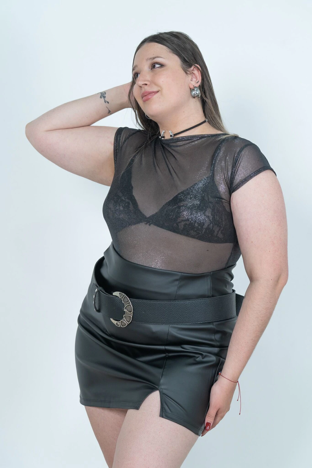 Transformá tu look con el BODY RUTH, negro transparente con brillo metálico. Es una prenda ideal para looks de noche, fiestas o para usar como sobreposición con tops, bralettes o incluso lencería estilosa.