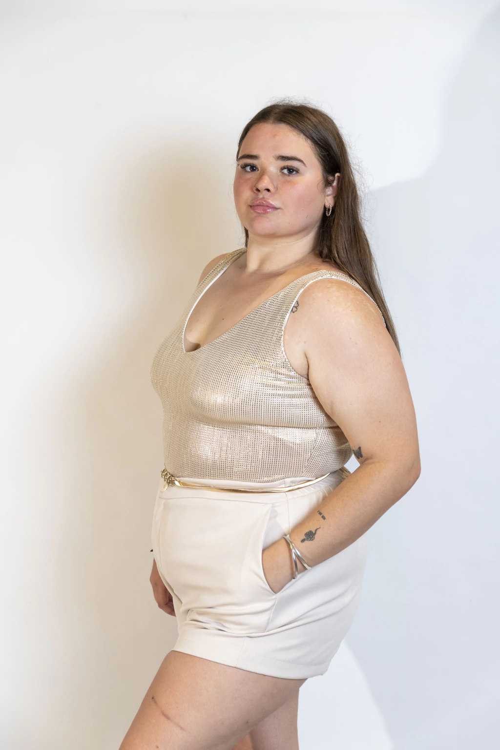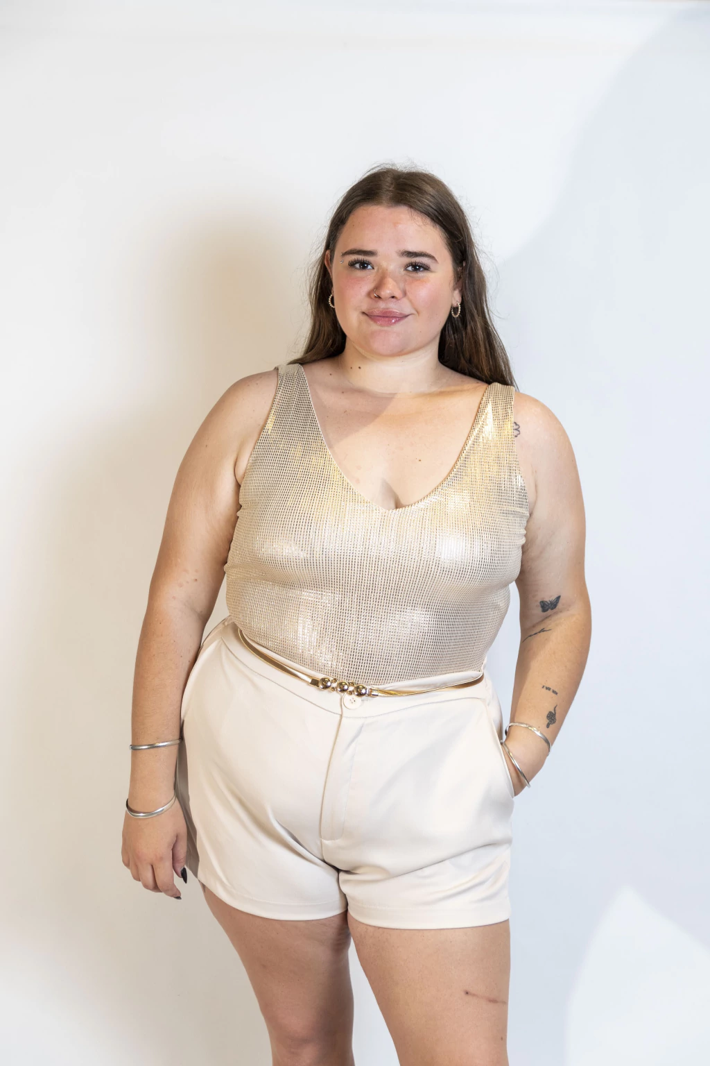 Hermoso body, de tela de foil, elastizado, un delicado brillo, bretel ancho, escote V en frente y espalda, se ajusta cómodamente al cuerpo, para usar con diferentes estilos y outfits