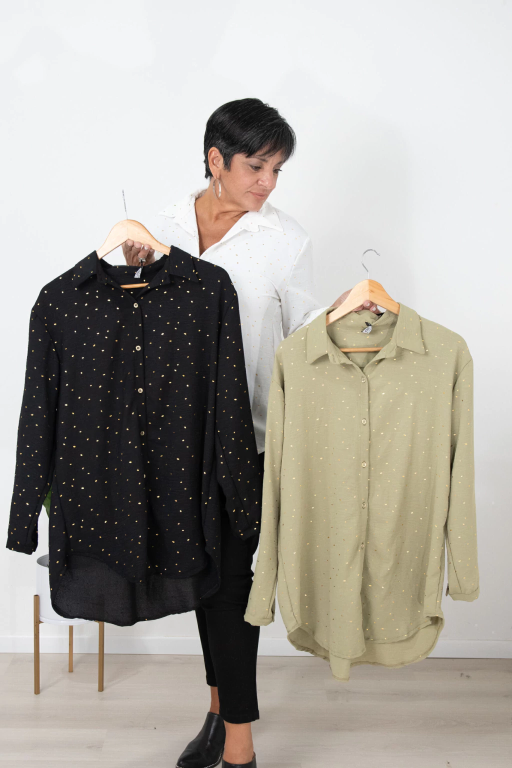 Delicado diseño de camisa de CEY con detalles en foil, Camisa mangas largas, colores de temporada, cuello y botones, una opción que vas a querer tener entre tus favoritos esta temporada, para lucir hermosa en tus reuniones