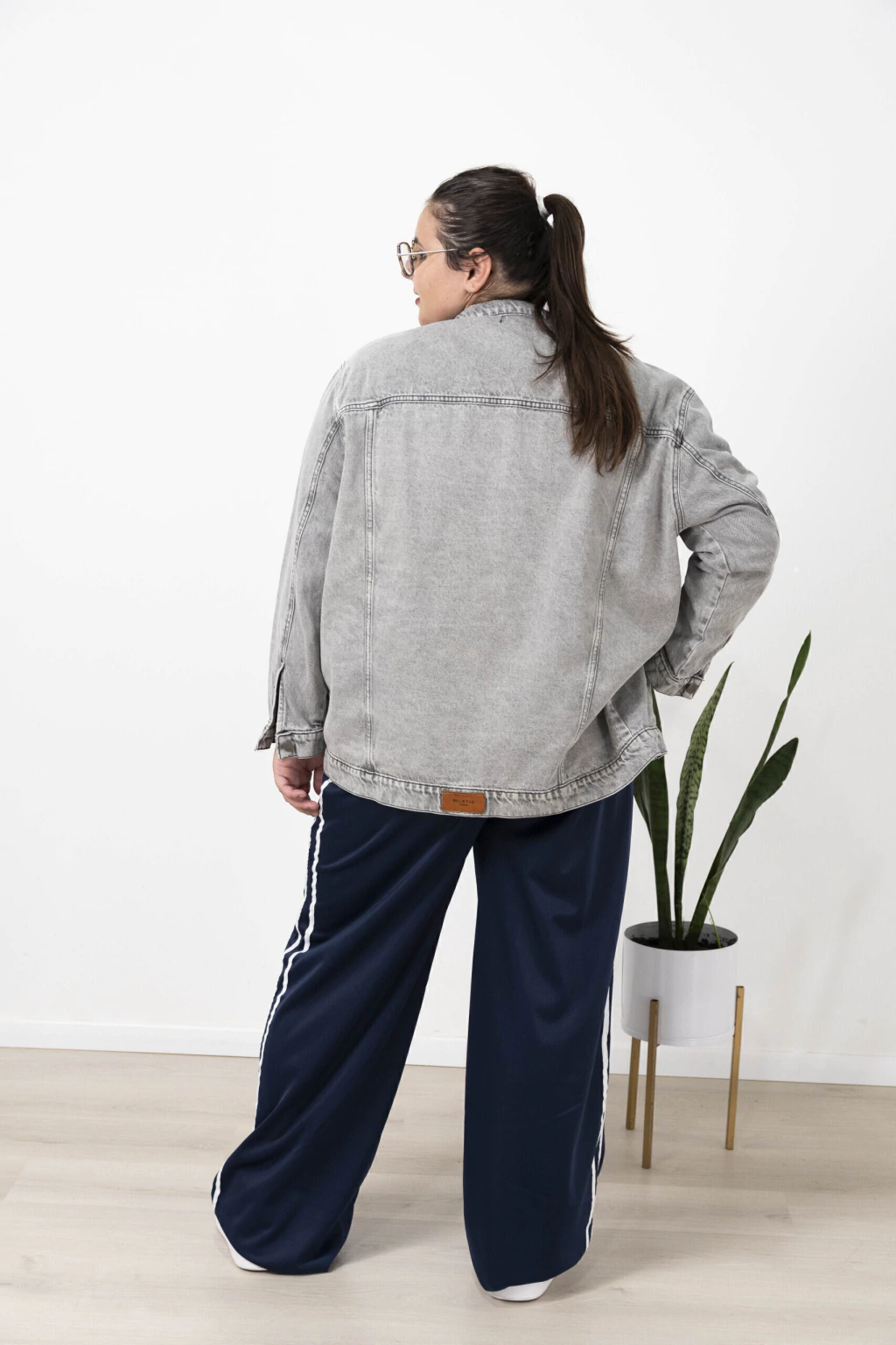 Campera de jean, rígida, corte oversize, con cuello, botones y bolsillos, color gris gastado, bien amplia, infaltable en tu placard para llevarla donde sea