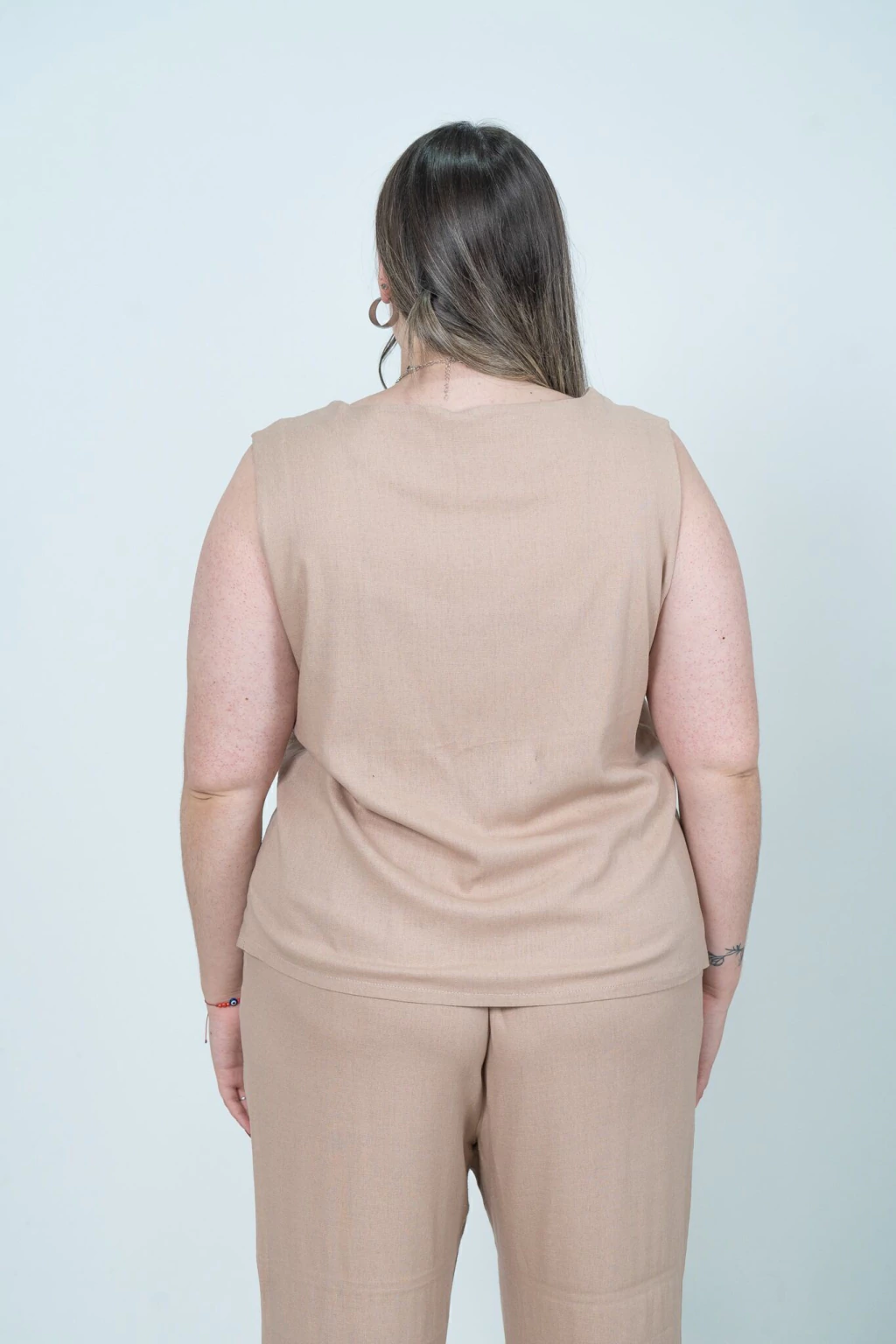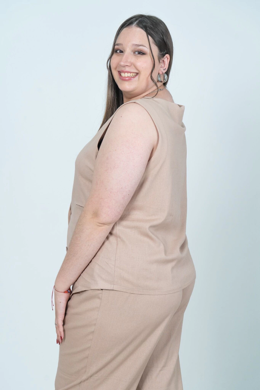 Chaleco de lino, con escote en V y botones delanteros grandes a tono. Su corte es recto con terminación en picos en el ruedo, estilizando la silueta.Con un diseño minimalista y elegante, combina practicidad con estilo, permitiéndote usarlo tanto como pieza principal en verano o en capas sobre camisas y remeras en los meses más frescos. Es perfecto para looks de oficina, salidas casuales o para sumar a un conjunto más formal con pantalón a juego.