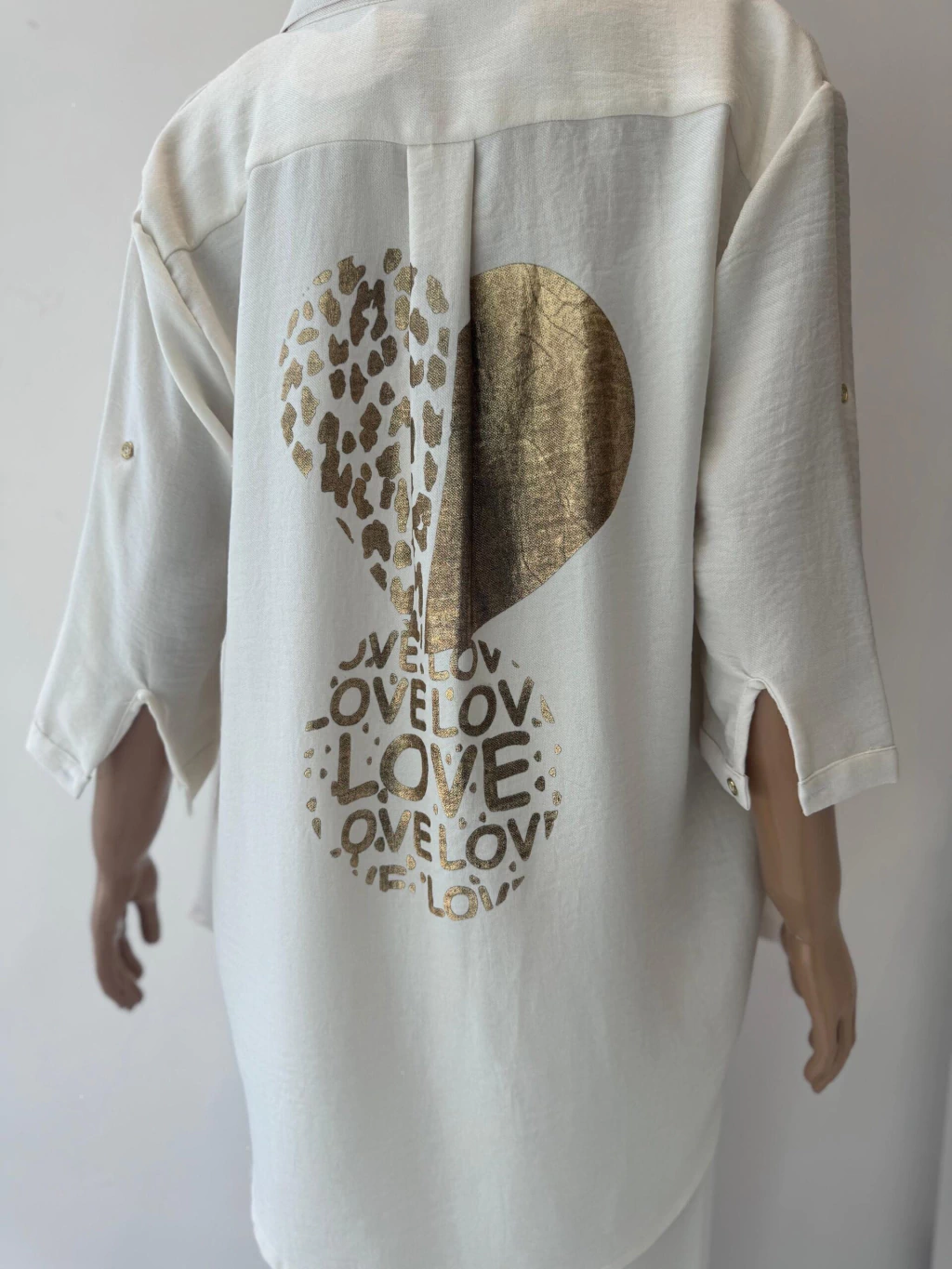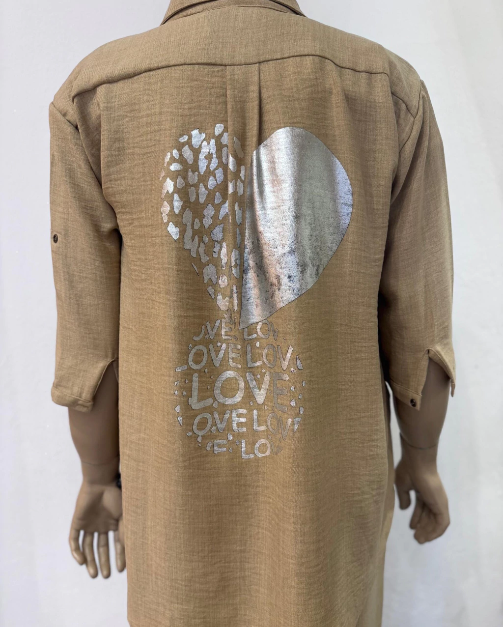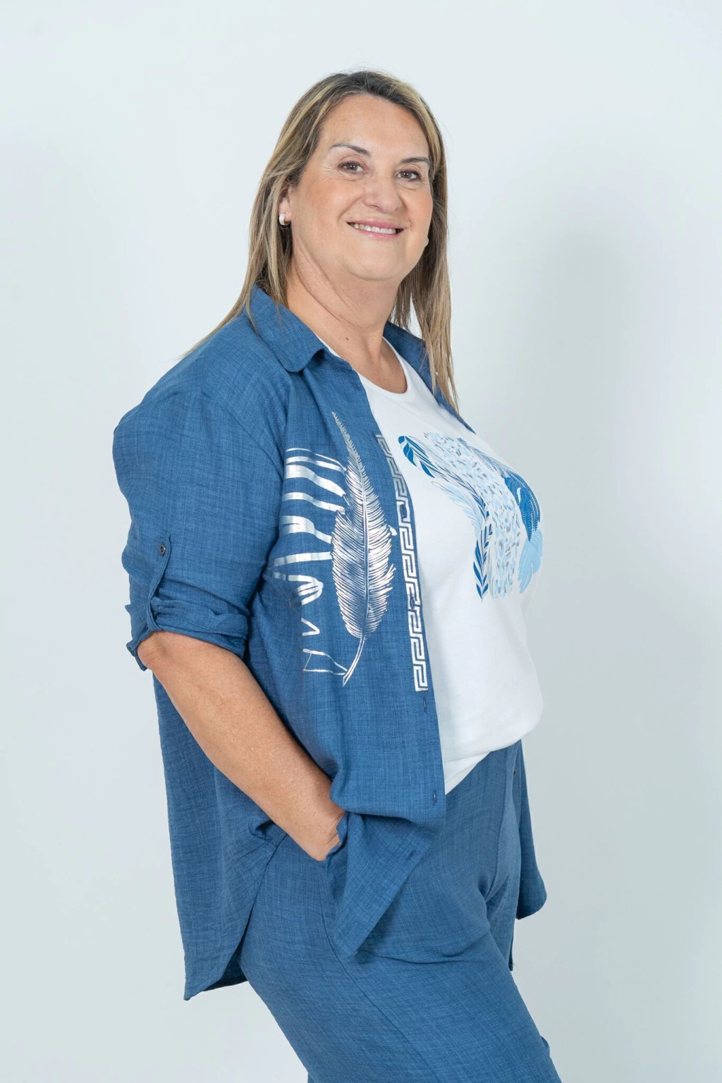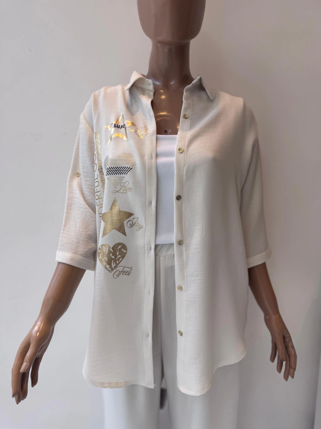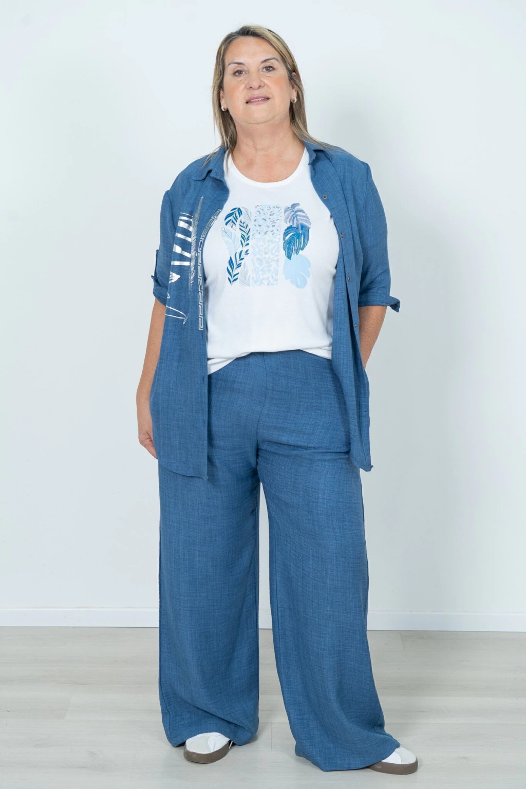 Incluye una camisa de manga 3/4, con cuello camisero, botones al frente y un diseño estampado con brillos metálicos en el frente y en la espalda, que aporta un toque moderno y distintivo. El pantalón es recto, de tiro alto y pierna ancha, confeccionado en la misma tela de cey fluida, creando un look monocromo que estiliza la figura y resulta muy fresco. Perfecto con zapatillas blancas para un look casual chic, o con sandalias planas para un estilo relajado.
