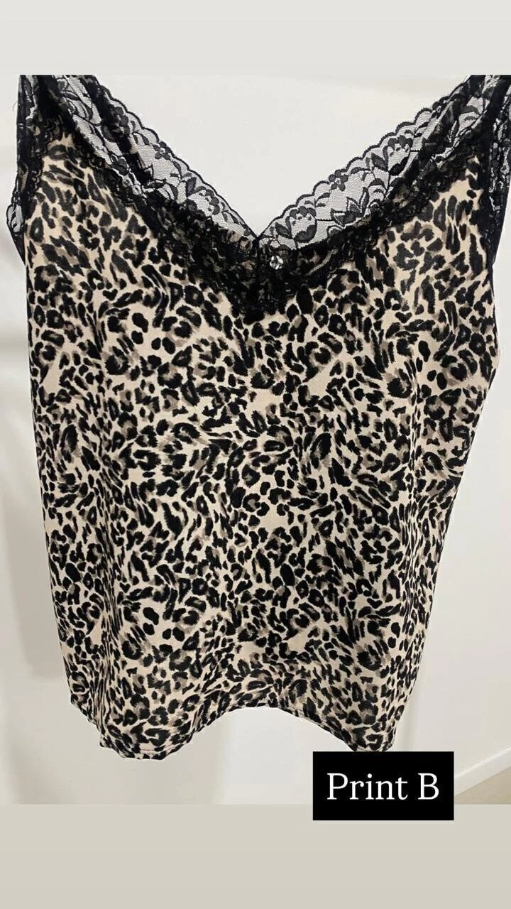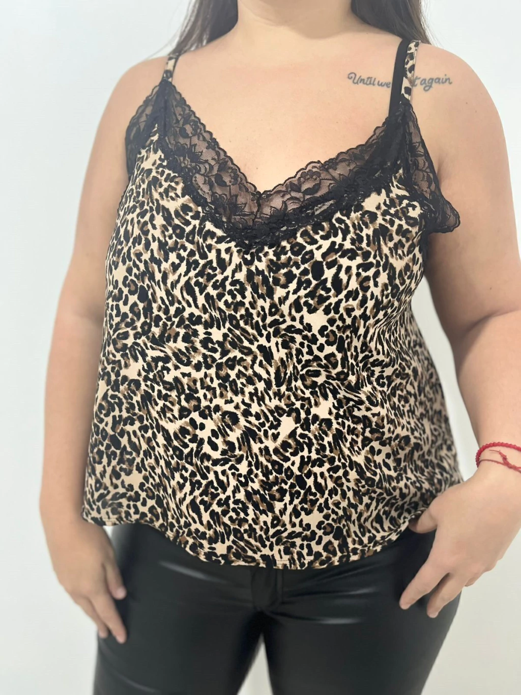 Fina y delicada musculosa de tela de gasa estampada en animal print, modelo lencero muy pedido, con puntillas en busto, ancha y corta, con breteles finos regulables.  Ideal para completar tu look