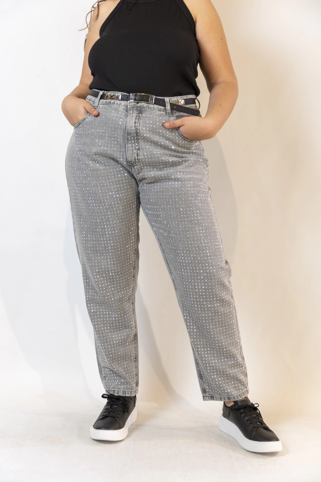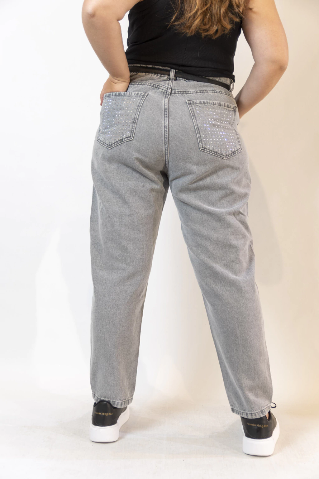 Jean corte mom, gris, corte bien ancho en piernas, rígido. Brillo en piernas en su frente y bolsillos de atrás. Si o si un elegido para realzar tus outfits