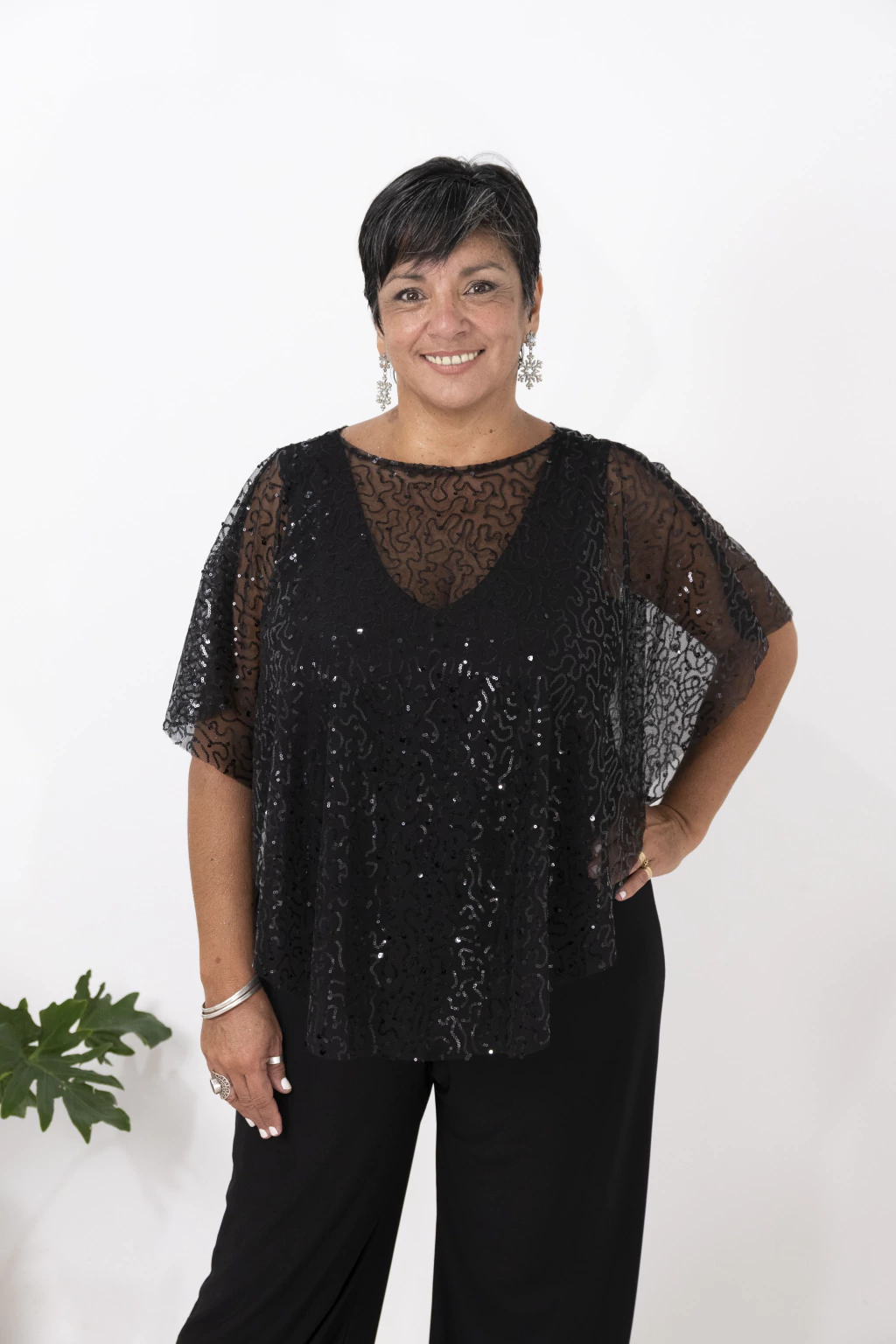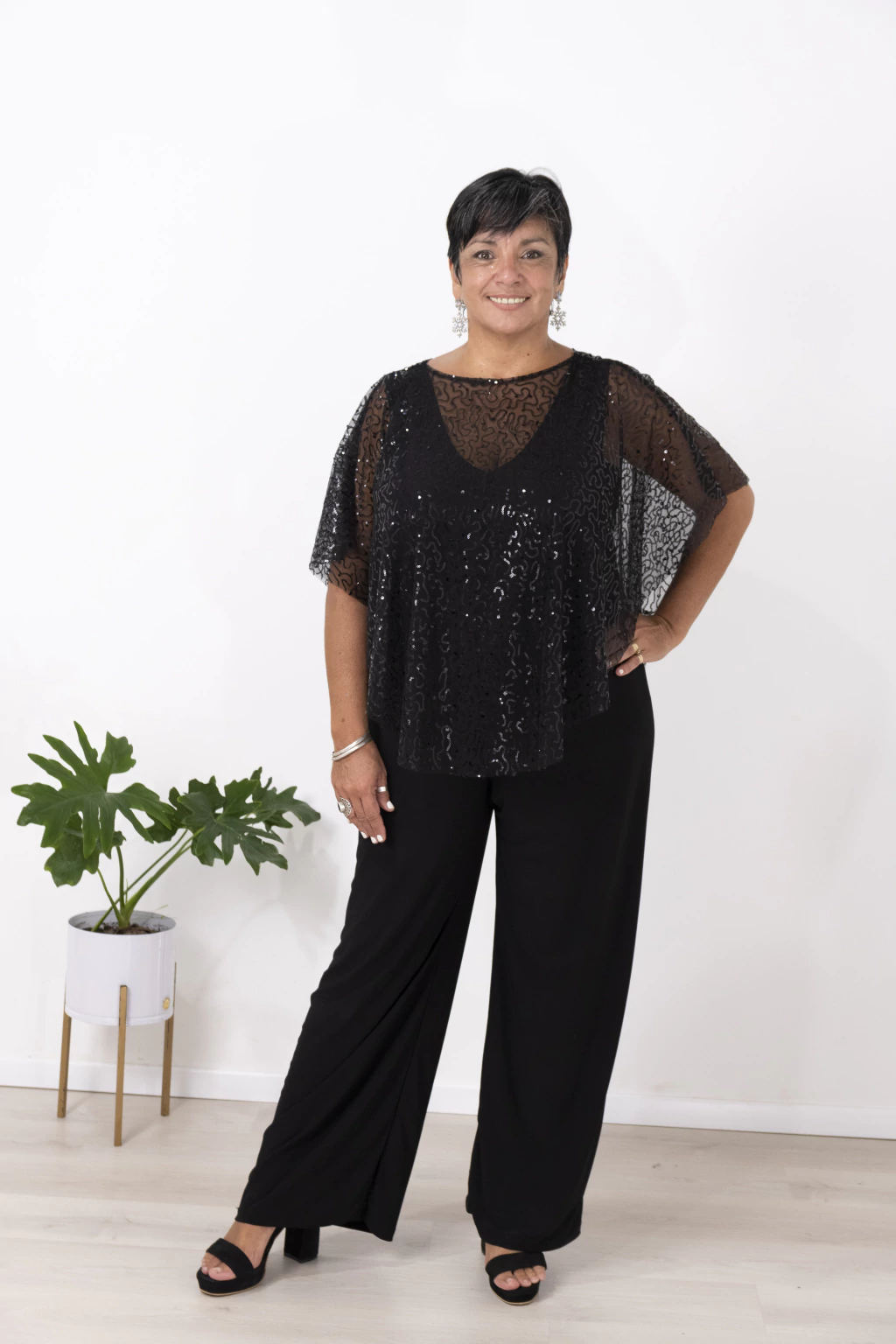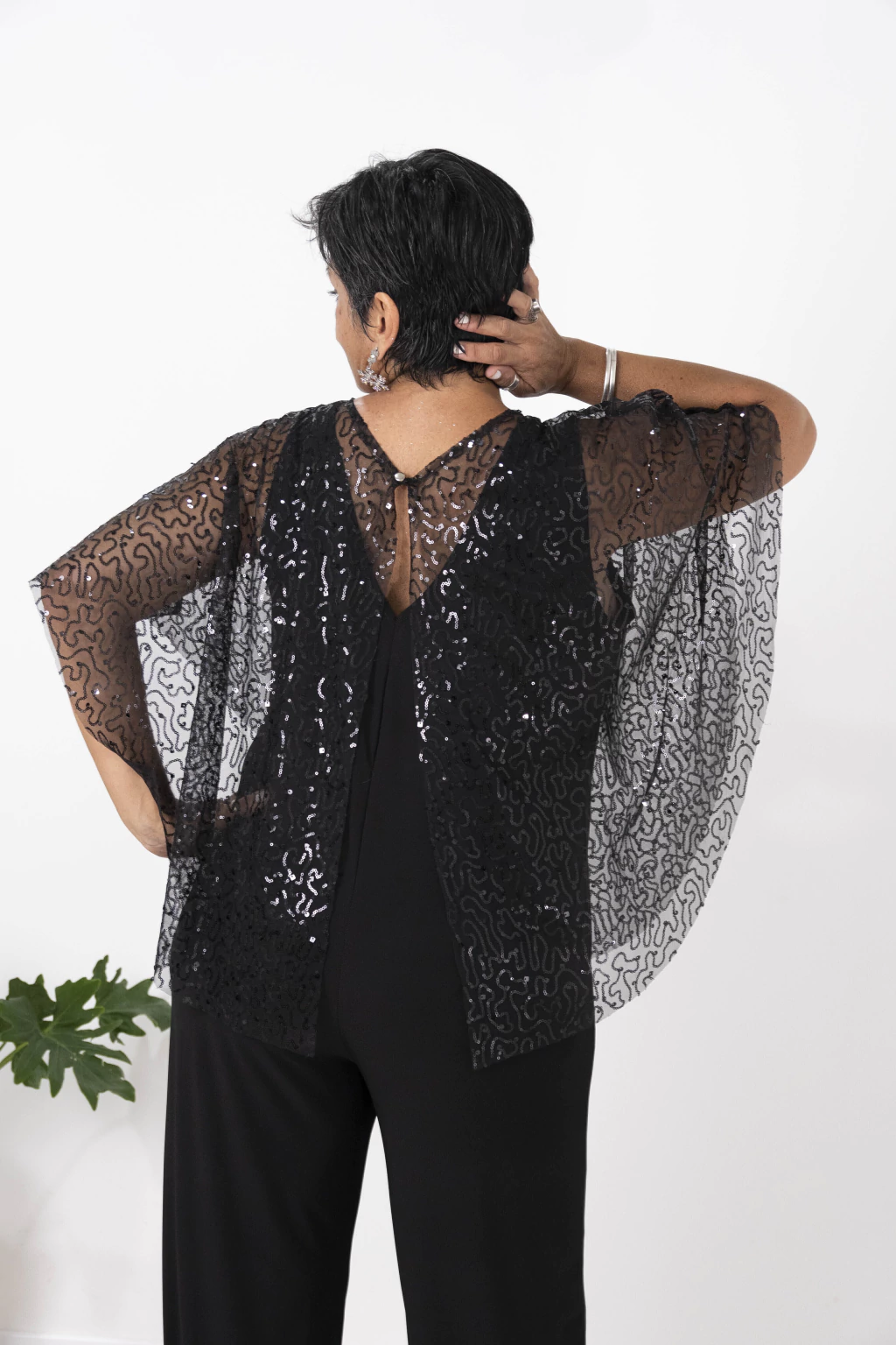 Fino y elegante mono, con un básico de jersey, elastizado y amplio. Con poncho superpuesto redondo de encaje con brillo,  le da el toque con su brillo y estilo.