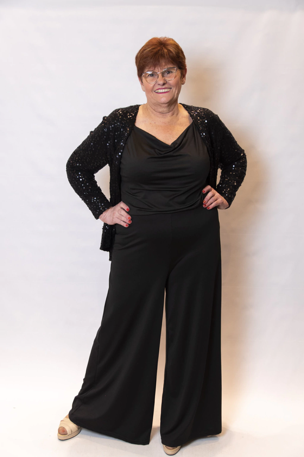Mono de seda elastizada, con breteles de tiras anchas con tacha y buche en su parte superior, piernas corte palazzo, una prenda que se ajusta facilmente al cuerpo por su elasticidad