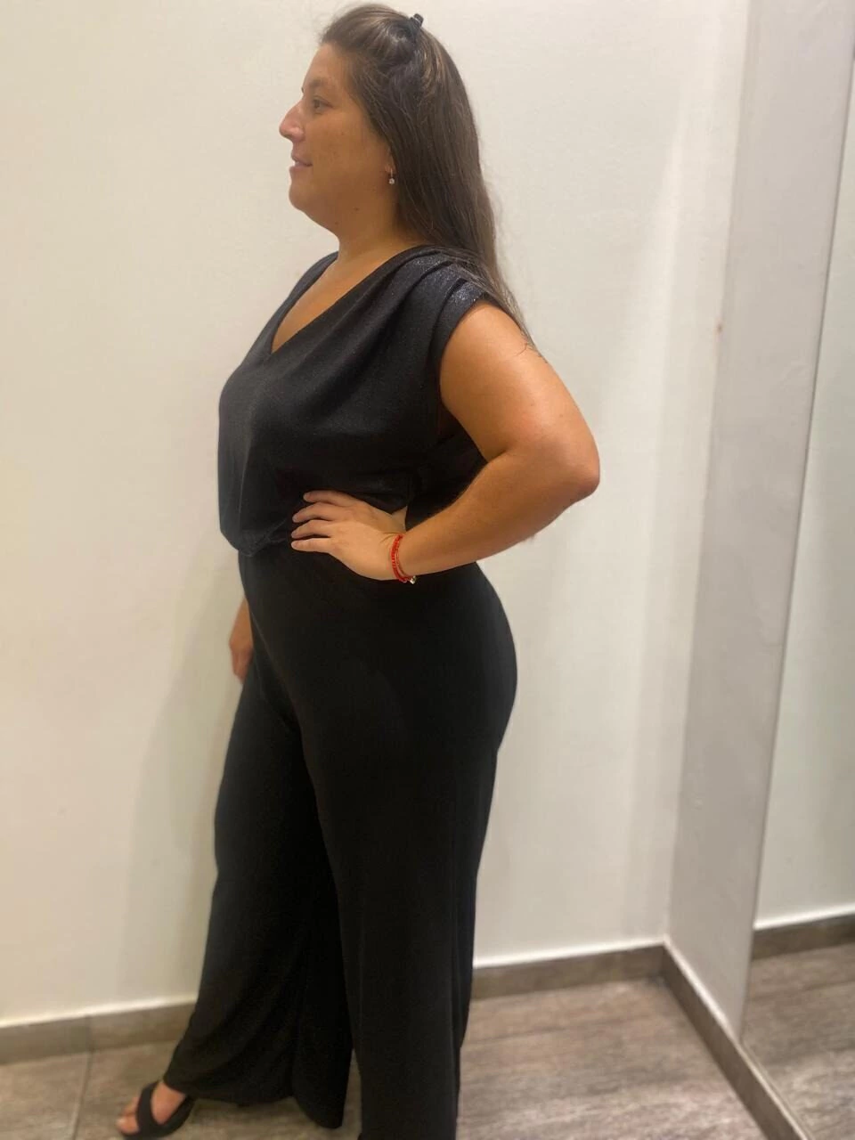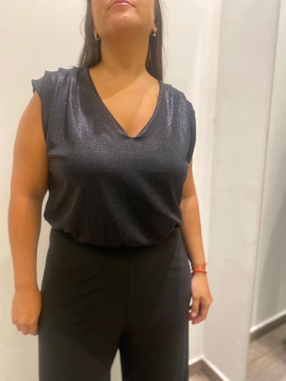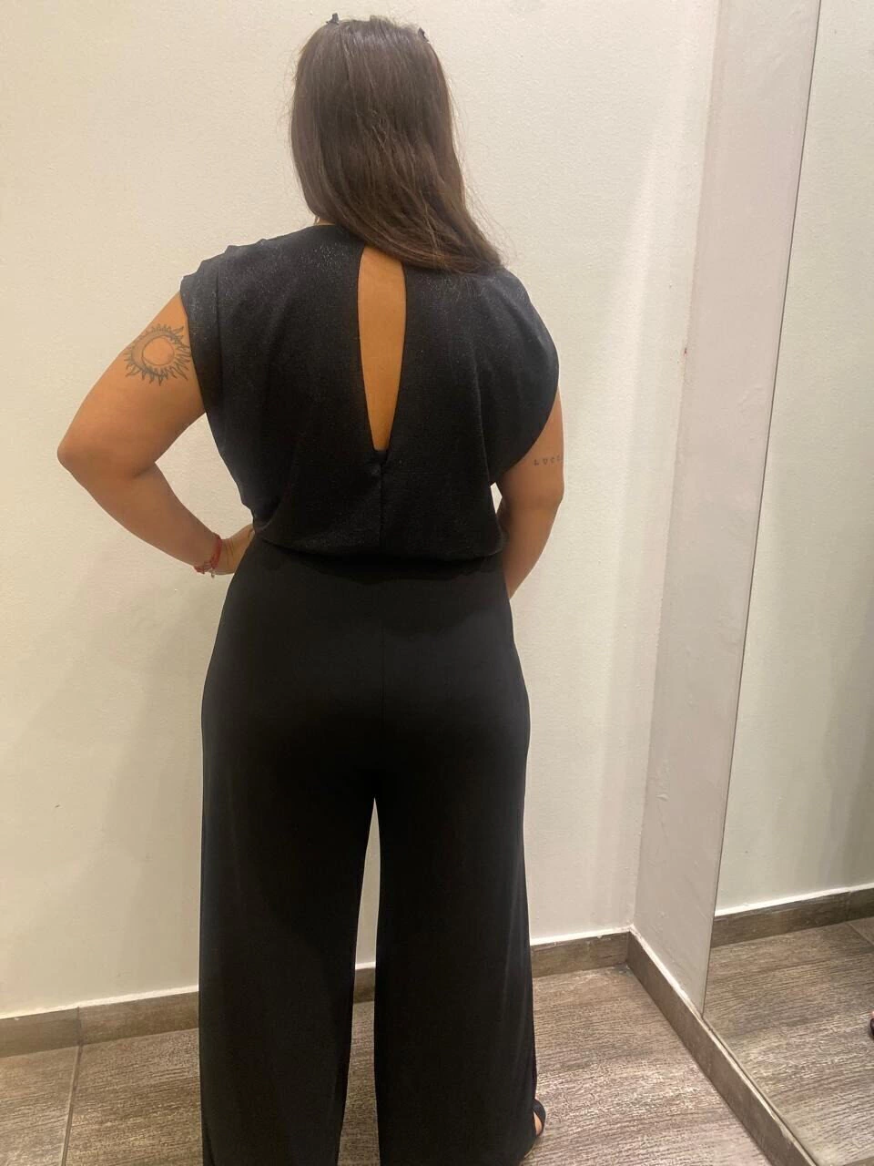 Fino, elegante, para una noche única. Hermoso mono con su canesú brilloso de foil, con mangas japonesa con funce, y pantalón de jersey de piernas bien anchas. Moderno y muy versátil. Un diseño que acompaña en tus eventos.  Brillo y estilo