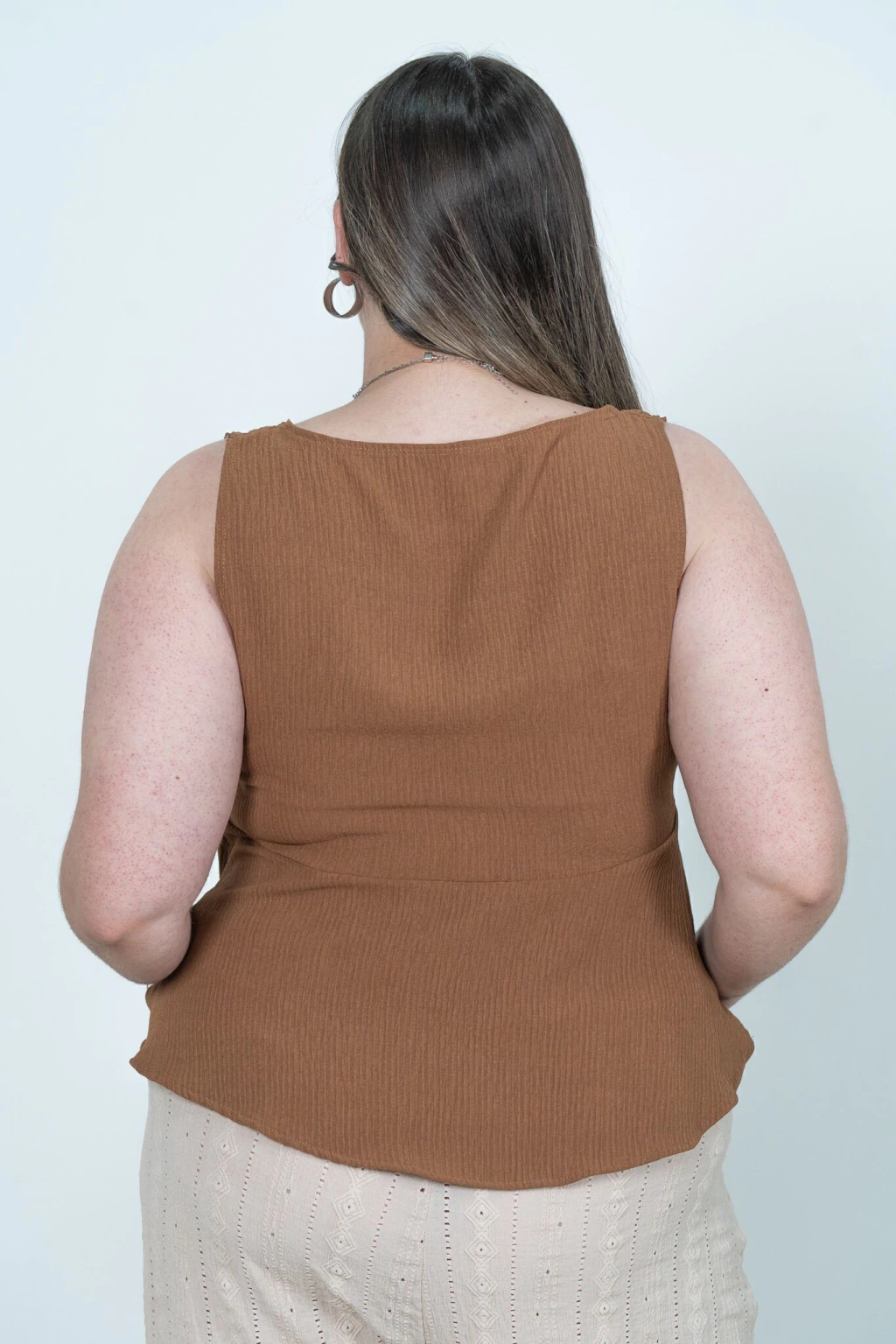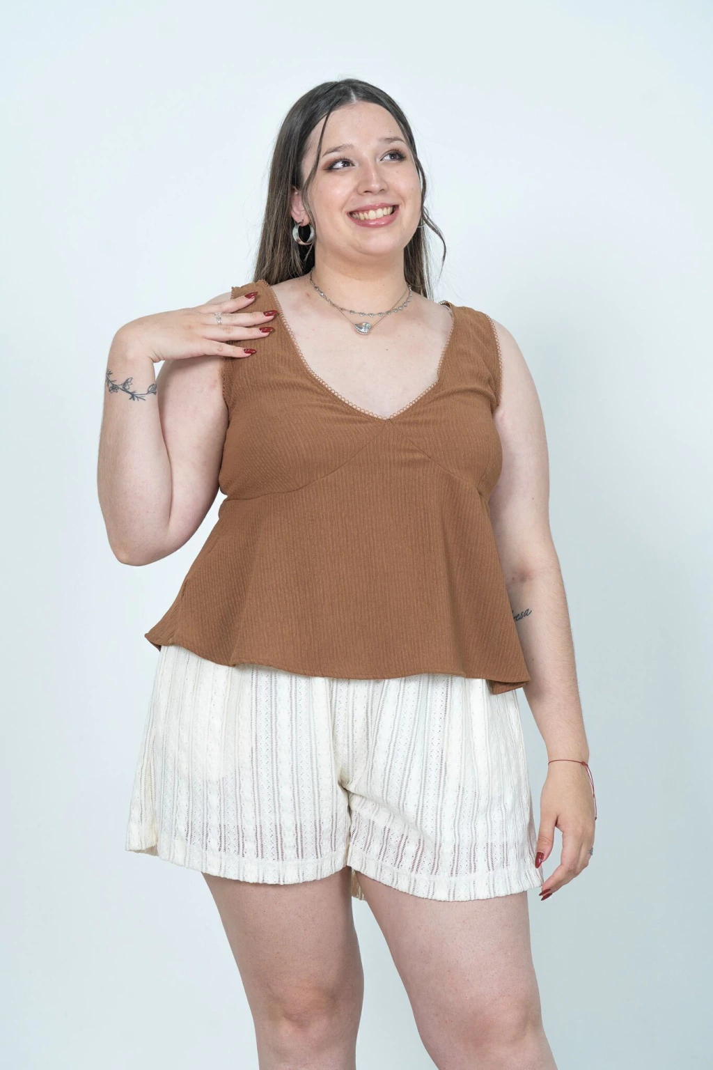 Confeccionada en tela liviana de crepe, con textura sutil acanalada. Su diseño incluye escote en V profundo en el frente, realzado por un delicado detalle de hilo en los bordes que suma un aire romántico. El corte bajo el busto estiliza la silueta y da un calce favorecedor. Perfecta para usar de día con jeans o shorts de tiro alto, y de noche con pantalones sastreros o faldas para un look elegante.