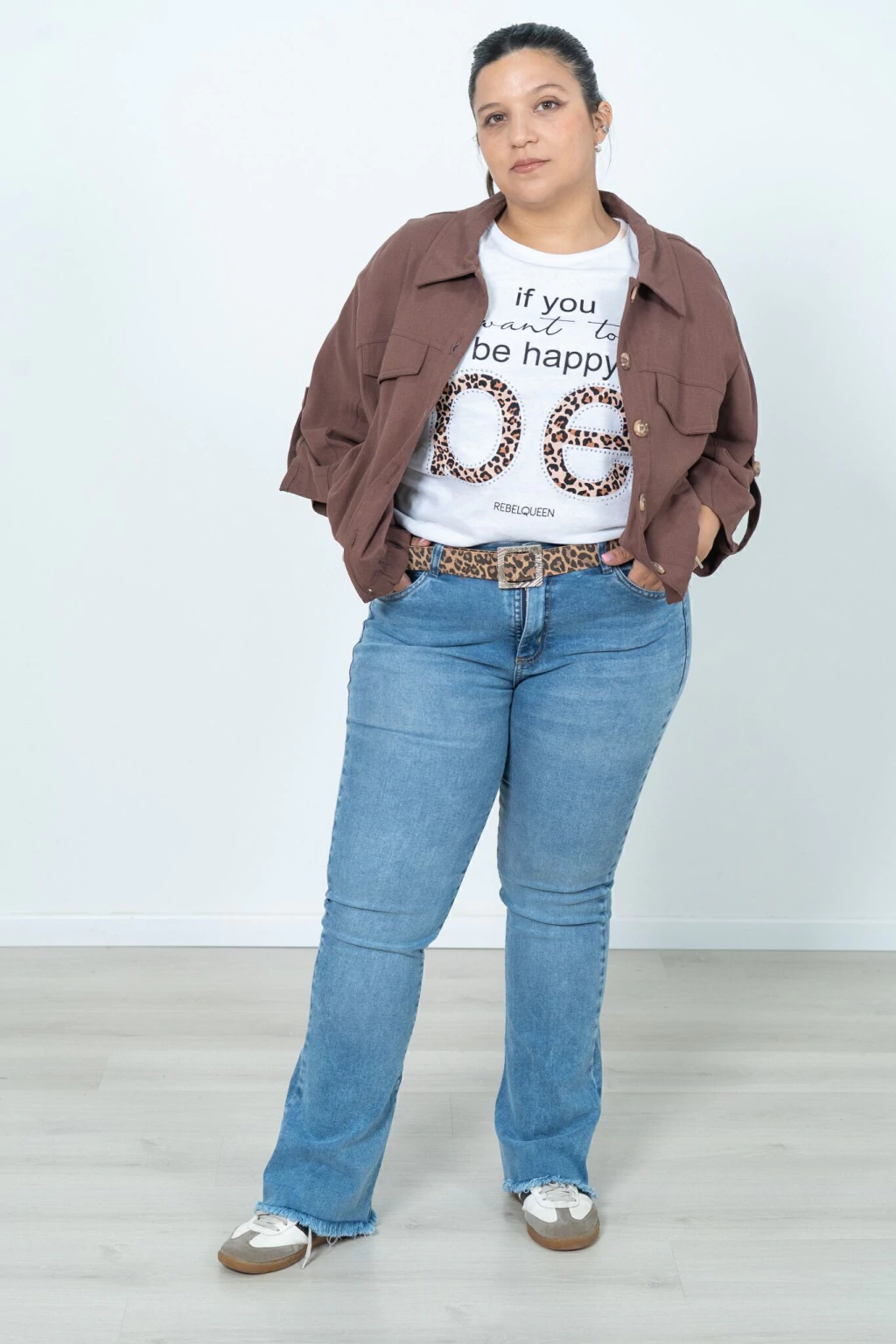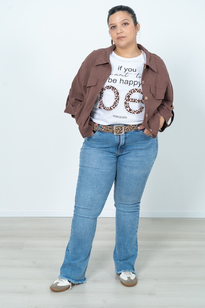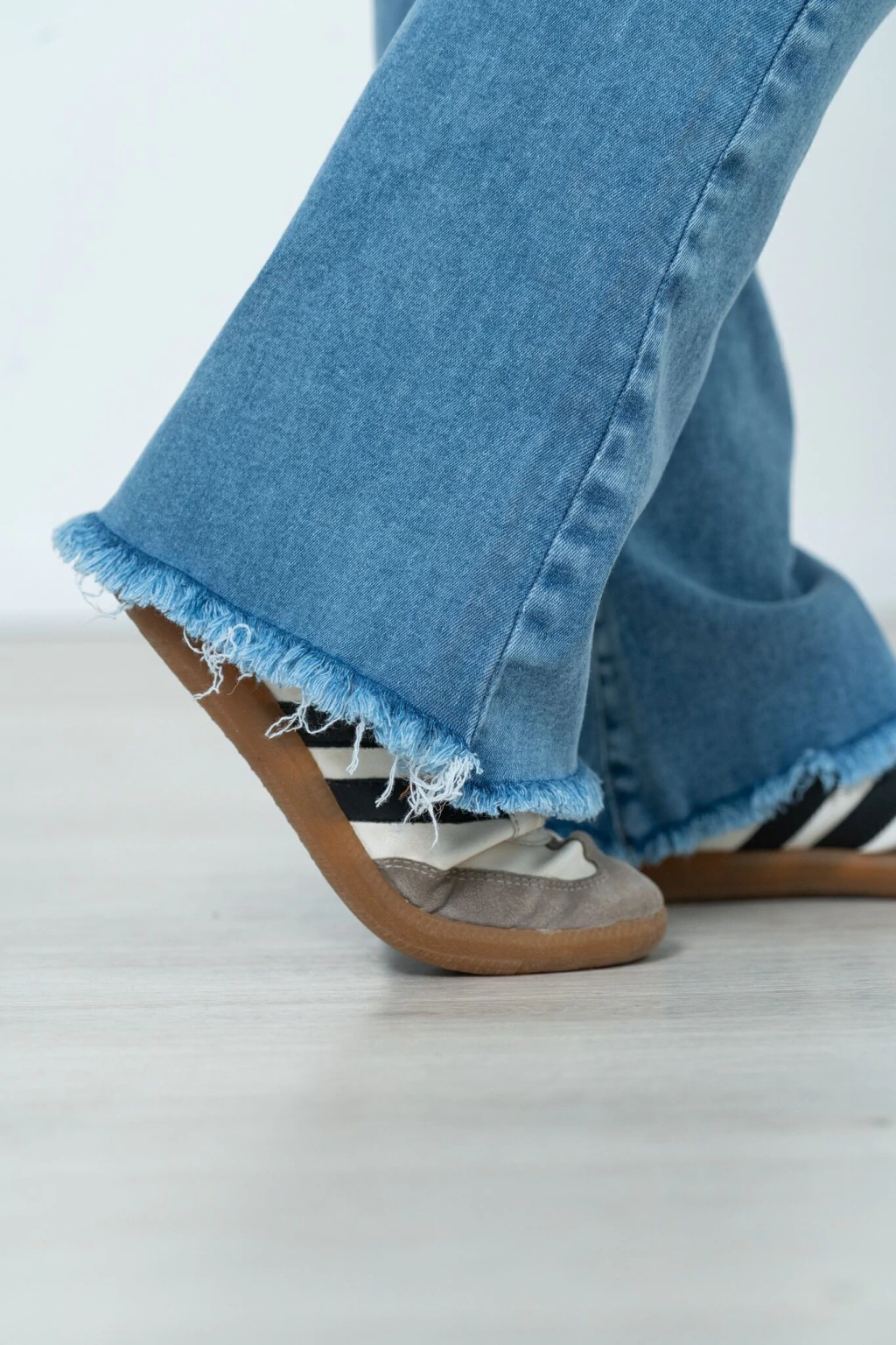 Pantalón de Cheta, confeccionado en denim azul medio con un sutil efecto de nevado. Presenta tiro alto que realza la cintura y un desflecado en la parte de la bota. Perfecto para llevar con tacones, botas o sandalias. Su estilo clásico con bolsillos delanteros y traseros lo convierte en un básico imprescindible.
