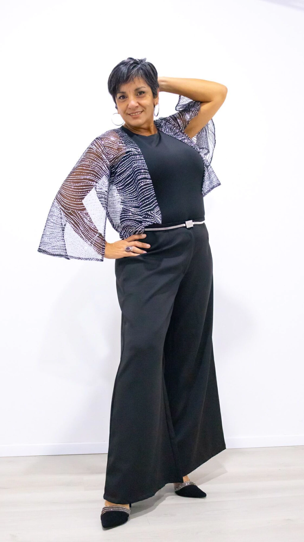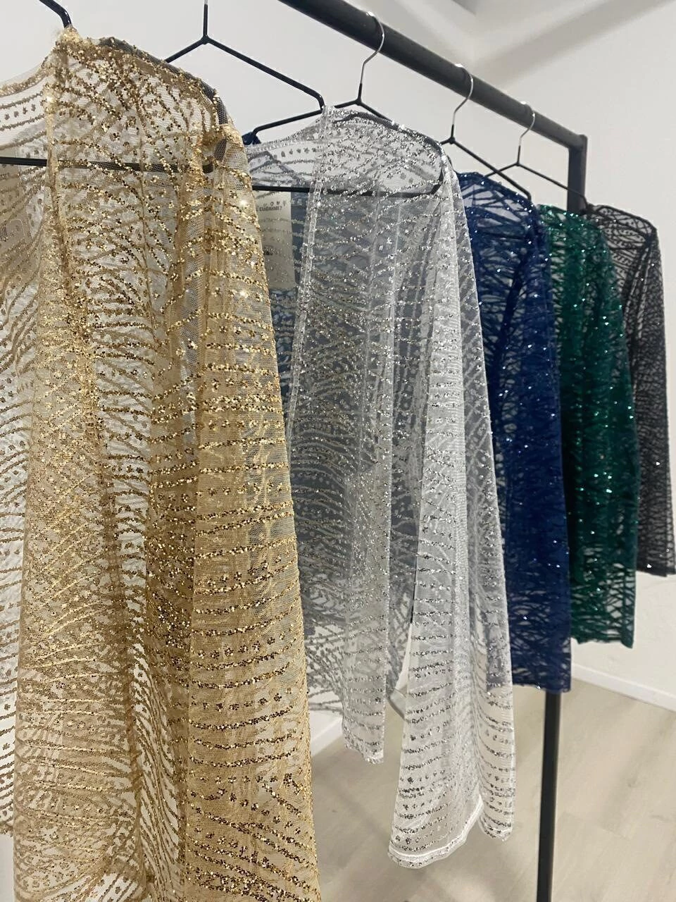 Una excelente opción para completar tu look para tu noche, formal, el complemento ideal para realzar tus conjuntos, de tul con pailette a la cintura, mangas largas corte Oxford con tajo, fino y elegante. Le da estilo a tus outfits