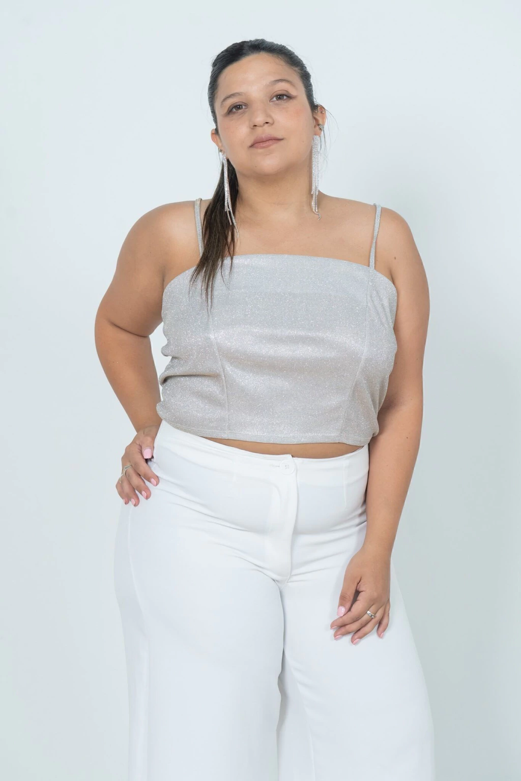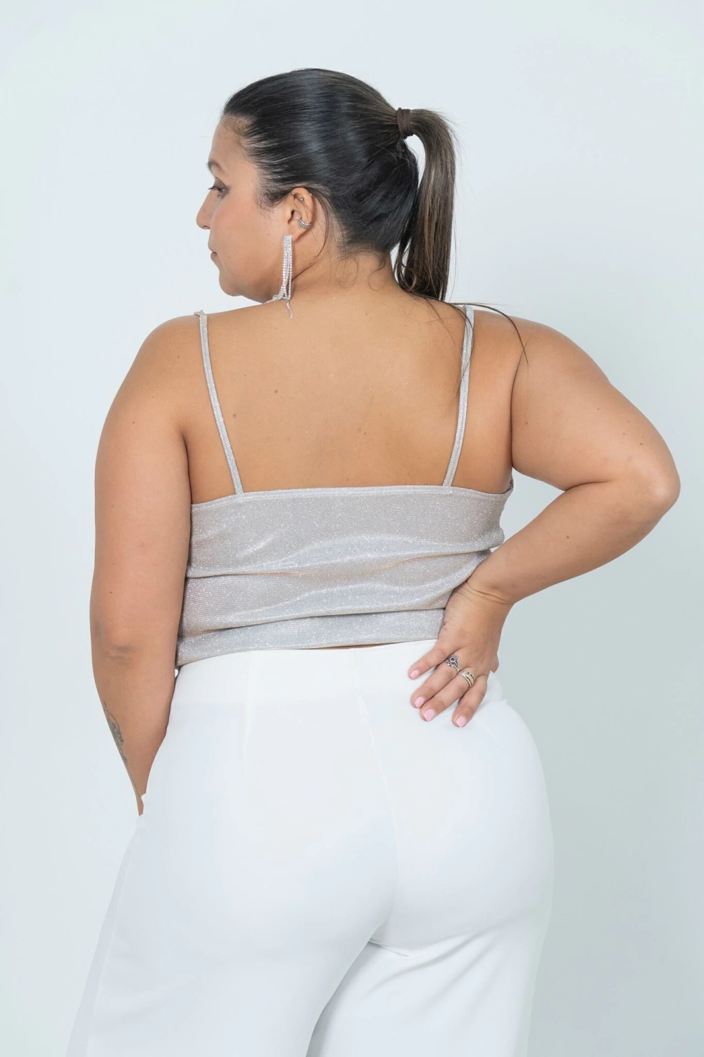 Top funcional y moderno, de glitter ,arreglado con recortes , bretel fino. Una gran opcion para tus outfits