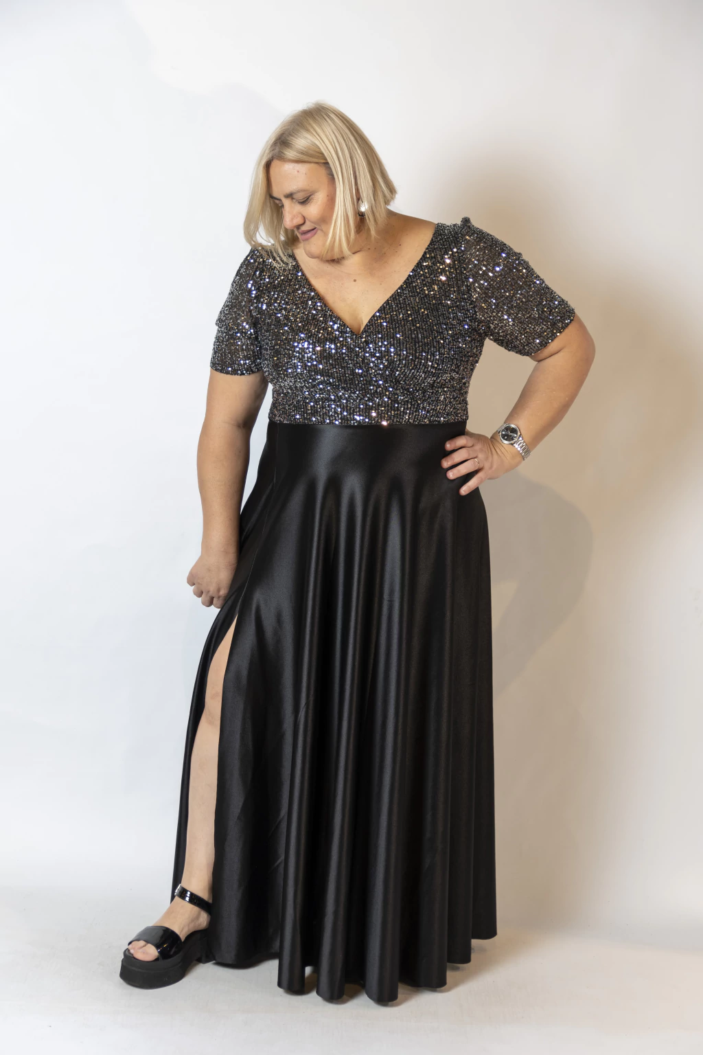Fino, elegante, para una noche única. Hermoso vestido con su canesú en Pailette, y falda con gran caída y movimiento de satén con un sensual tajo. Escote cruzado, que estiliza, mangas cortas. Una excelente opción, brillo y estilo para tus eventos con este modelo